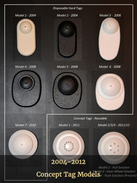 With every new model we got better security as well as better detection – both very important factors! As it shows in the photos, we moved from a slim tag design towards a DesignerTag design early 2010. Then we decided, due to the recession, that a Disposable Hard Tag wasn’t the right solution in the present economic environment. So, we renamed the product to CONCEPT SOLUTION, completely rethought the idea and went with the 3-ball clutch mechanism knowing that this locked the best on smooth PinShaft. It took us a few years to reach a well working mechanical solution and we spend another 14 months upgrading the Concept Solution after the first prelaunch early 2014.