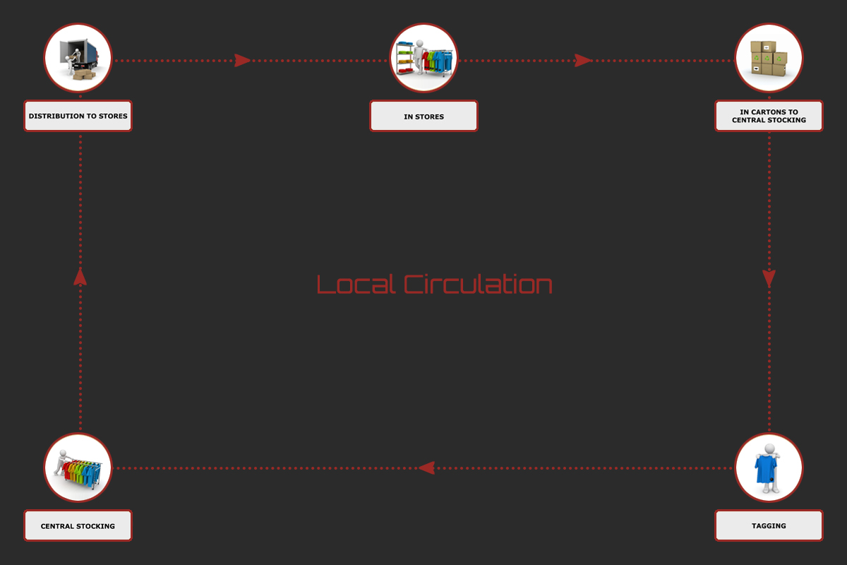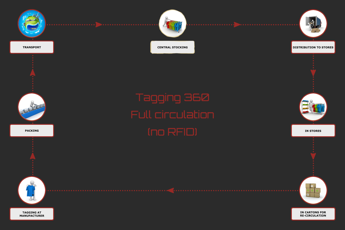 The Concept Tag will be shipped directly to the Fashion Retailer's manufacturer, who will maintain a minimum stock. The packaging of the garment was seriously considered when designing the Concept Tag. That is why it is one of the overall smallest and most lightweight hard tags on the market. Tagging will take place at the manufacturer's facilities (including the programming of the RFID chip). The garments are all secured by the Concept Tag through transport, stock handling and in the stores. When removed from the garment, the Concept Tag parts will be loaded into containers at the central warehouse. It will then be shipped to the Fashion Retailer's manufacturers. The RFID chip will be re-programmed and the Concept Tag put on the new garment, starting another circulation. Please study our schematics showing three ways of using the Concept Solution.